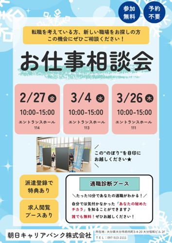 10月のお仕事相談会のご案内です。 ご予約なしで参加OK!ちょっと話を聞いてみたい方も大歓迎です。 ぜひお気軽にお立ち寄りください♪[日時] 2025年10月28日(火) [時間] 10:00~15:00 [場所] J:COM ホルトホール大分 1Fエントラン...