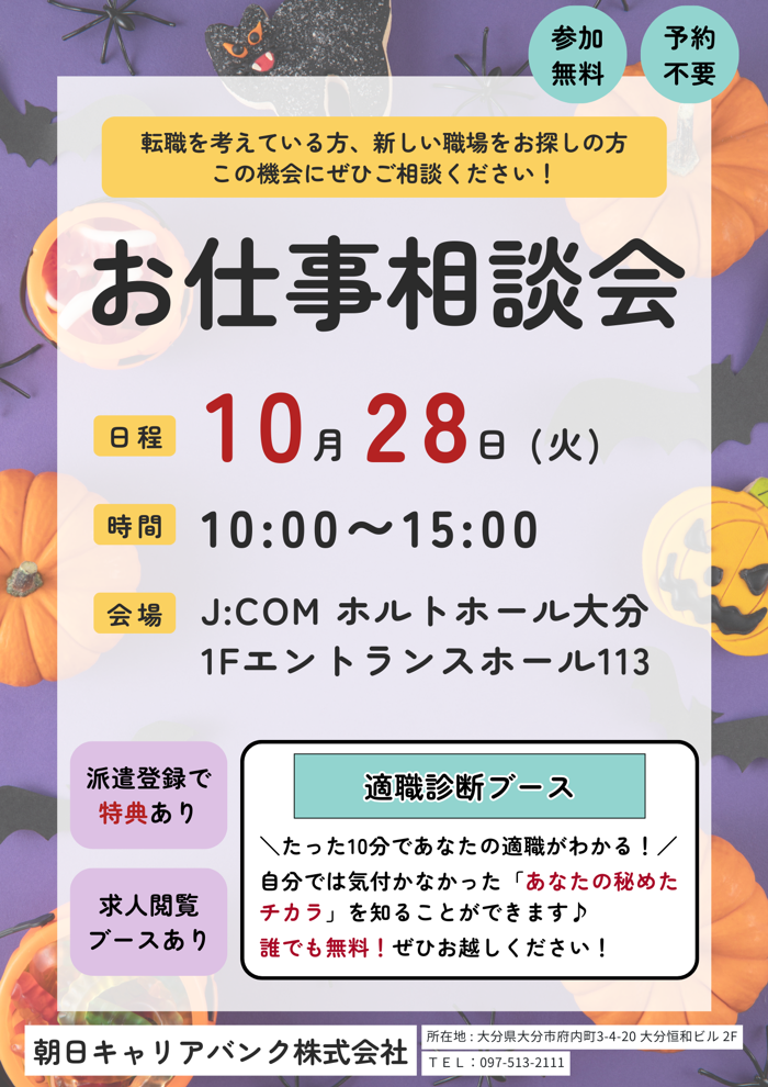 [日時] 2025年10月28日(火) [時間] 10:00~15:00 [場所] J:COM ホルトホール大分 1Fエントランスホール113
